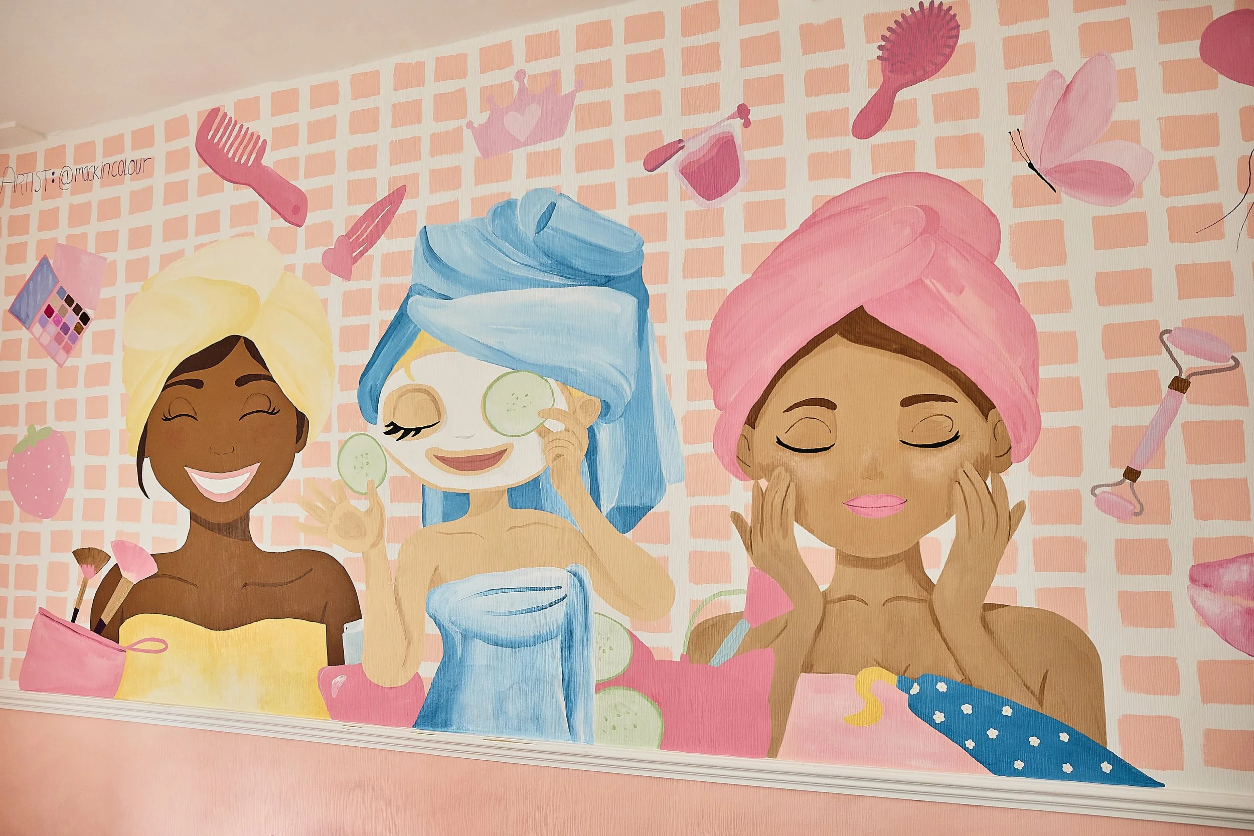 Booking from 1st October, Robe on Arrival, Head Bands and Eye Patches to keep Coloured Hair Extensions with Mini Style Mini Make Over with Sparkly Eyes, Nail Paint Hands and Feet, Foot Spas With Tattoos, Red Carpet Mini Disco Food Party Bags Colouring
